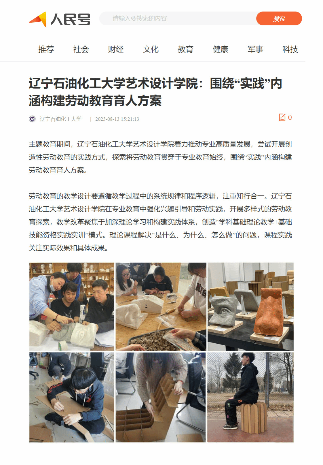 编者按:人民日报客户端·人民号、辽宁日报·北国号对我校艺术设计学院在开展主题教育期间,着力推动专业高质量发展,尝试开展创造性劳动教育的实践方式,探索将劳动教育贯穿于专业教育始终,围绕“实践”内涵构建劳动教育育人方案进行了宣传报道。现将相关报道转载如下: