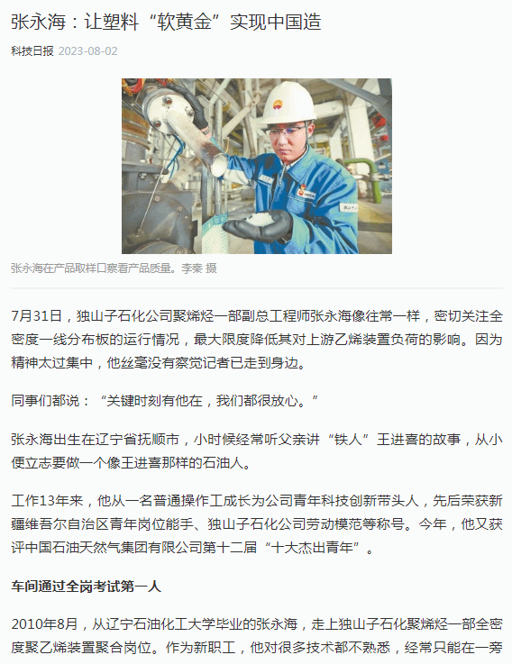 科技日报、学习强国:张永海:让塑料“软黄金”实现中国造