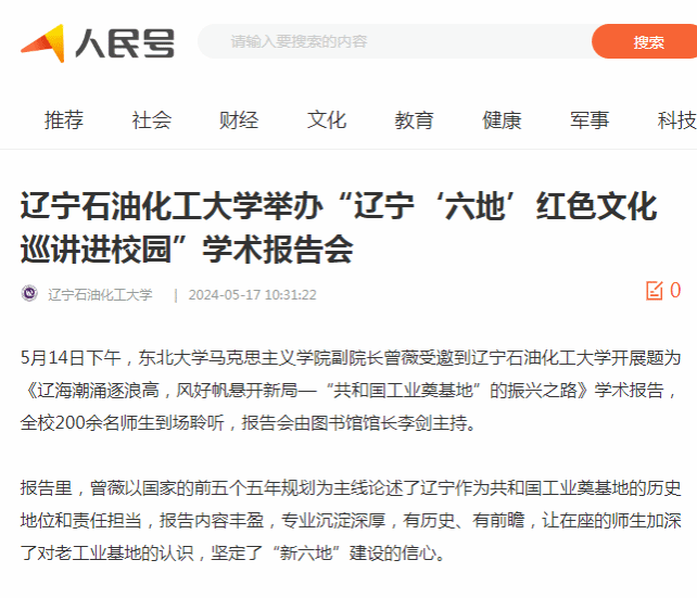 编者按:近日,中国大学生网、人民日报客户端·人民号、辽宁日报·辽望号对我校图书馆邀请东北大学马克思主义学院副院长曾薇来校开展题为《辽海潮涌逐浪高,风好帆悬开新局—“共和国工业奠基地”的振兴之路》学术报告进行了宣传报道。现将相关报道转载如下: