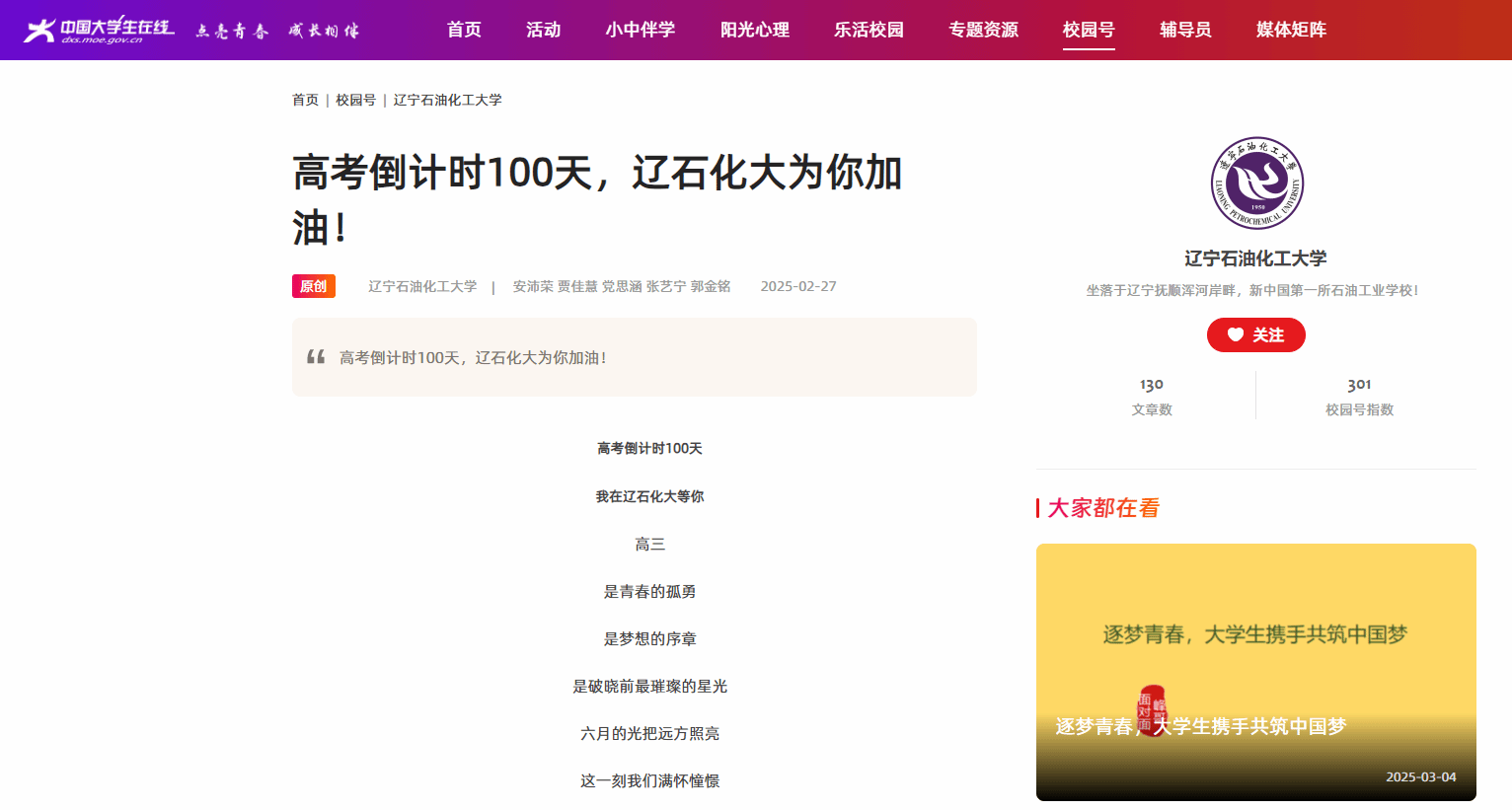 编者按:高考倒计时100天,学校新媒体学子撰文《辽石化大为你加油!》,为2025高考生精心制作加油大礼包。教育部中国大学生在线网对此文进行了宣传。现将相关报道转载如下: