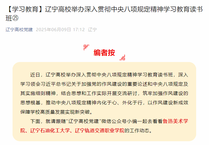 编者按:近日,辽宁高校举办深入贯彻中央八项规定精神学习教育读书班,深入学习领会习近平总书记关于加强党的作风建设的重要论述和中央八项规定及其实施细则精神,结合思想和工作实际开展交流研讨,筑牢加强作风建设的思想根基,推动中央八项规定精神内化于心、外化于行,以作风建设新成效保障学校高质量发展实现新突破。6月9日,辽宁高校党建微信公众号以《辽宁高校举办深入贯彻中央八项规定精神学习教育读书班㉕》为题,对我校召开深入贯彻中央八项规定精神学习教育第3期读书班暨2025年党委理论学习中心组第八次集体学习会议进行了组稿宣传。现将相关报道转载如下: