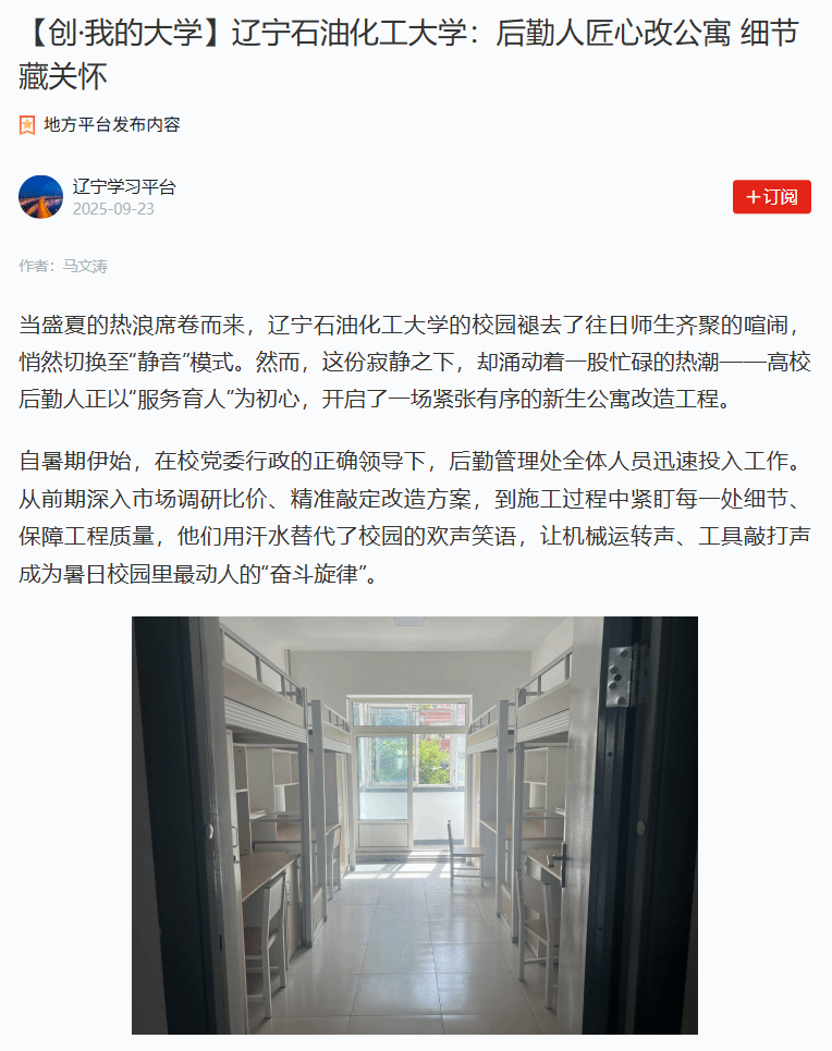 编者按:自暑期伊始,在校党委行政的正确领导下,后勤管理处全体人员迅速投入工作。从前期深入市场调研比价、精准敲定改造方案,到施工过程中紧盯每一处细节、保障工程质量,他们用汗水替代了校园的欢声笑语,让机械运转声、工具敲打声成为暑日校园里最动人的“奋斗旋律”,也通过辛勤劳作使国产亚洲综合一区二区三区_亚洲欧美日韩中文天堂_尤物在线观看视频不卡无码_国产最新精品亚洲2025不卡_亚洲成Av人在线观看片水蜜桃宿舍焕然一新。学习强国辽宁学习平台、人民日报客户端·人民号、辽宁日报·辽望号、搜狐号、中国大学生网对其进行了宣传报道,现将相关报道转载如下: