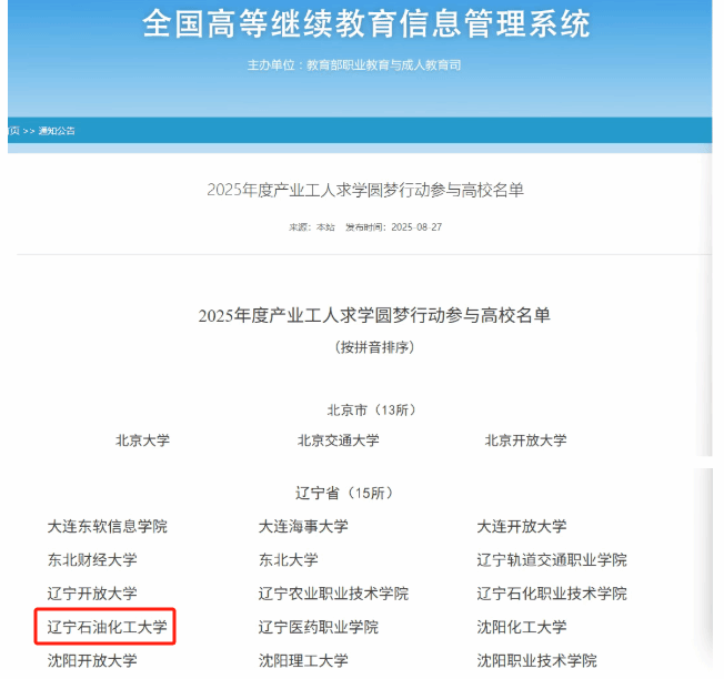 此次入选不仅是对我校继续教育办学质量和社会服务能力的高度认可,更为学校进一步拓展服务地方经济社会发展、服务石油石化企业、服务广大生产一线职工提供了重要平台。下一步,我校将以此为契机,持续优化人才培养方案,深化校企合作,努力打造具有示范引领作用的“求学圆梦”教育品牌,为推动新时代产业工人队伍建设贡献辽石化大力量。(撰稿人:修景师 校对人:赵侠 审稿人:仲崇民)